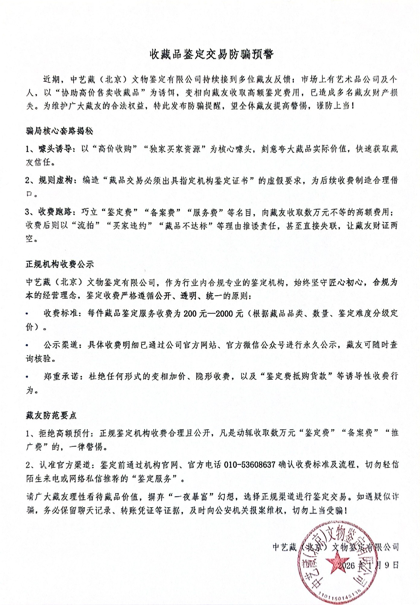 近期,中艺藏(北京)文物鉴定有限公司持续接到多位藏友反馈:市场上有艺术品公司及个人,以“协助高价售卖收藏品”为诱饵,变相向藏友收取高额鉴定费用,已造成多名藏友财产损失。为维护广大藏友的合法权益,特此发布防骗提醒,望全体藏友提高警惕,谨防上当!
