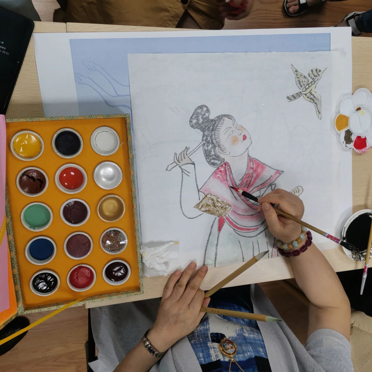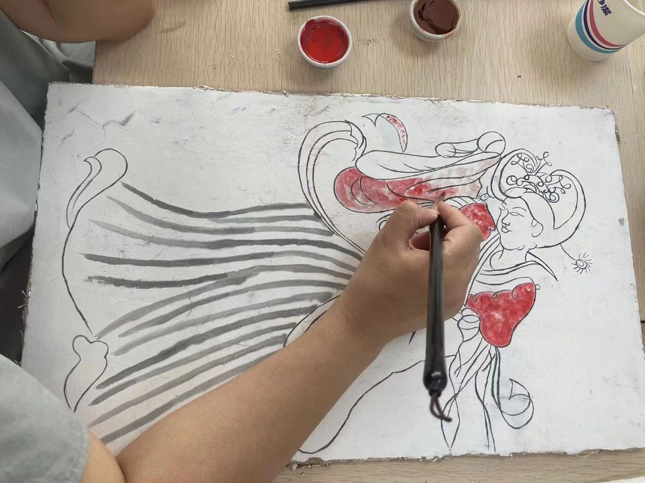 全程采用矿物颜色,泥板制作、泥土做旧是为了更接近于原壁画的绘制系统和表现方法,也给学员们带来了一次兼具动脑和动手的实践课,让每个人都能走进唐代壁画的人物故事中,切身感受模拟唐代绘画的乐趣。